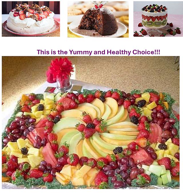 Firstly, just choose ONE dessert (Yummy and Healthy…!) that is your absolute favourite and have treat yourself to a small portion. For example, if Christmas pudding is your weakness, then have a slither (and not a massive hunk) and forget the cream & ice-cream with it…just add a little custard. Or if Pavlova is more your thing, have a small serve with a LOT of fruit (and minimal cream).